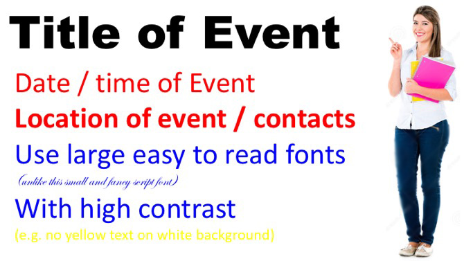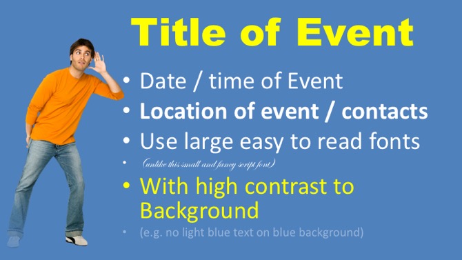 - Slides should include all essential information Event/date/time/location/contacts etc.